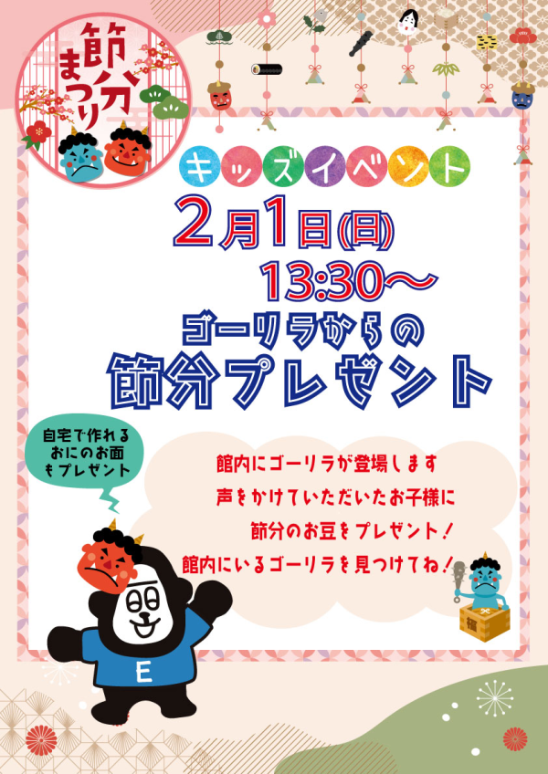 館内にゴーリラが登場します♪声をかけていただいたお子様には節分の豆菓子やご自宅で作れる鬼のお面をプレゼントいたします。